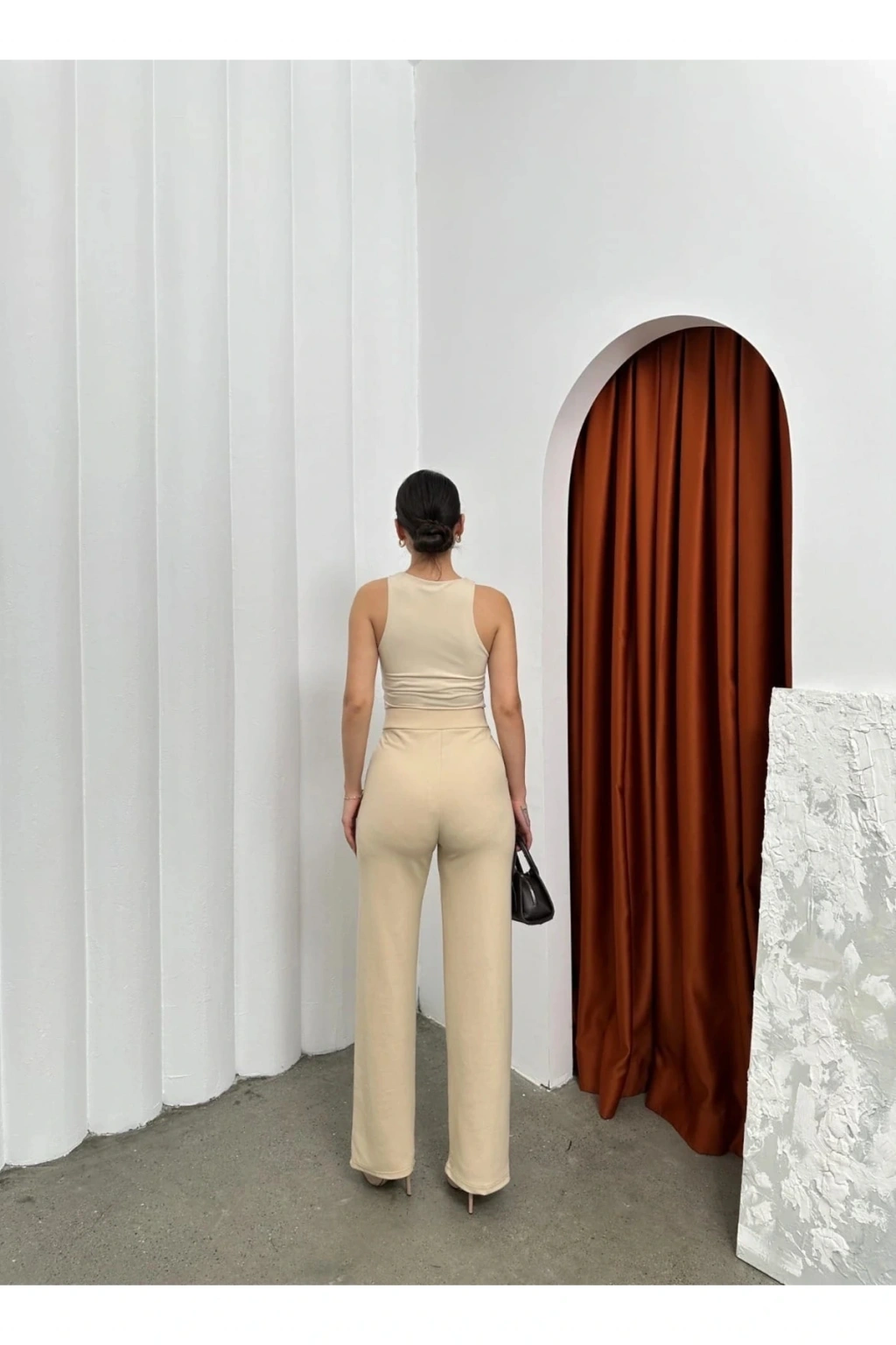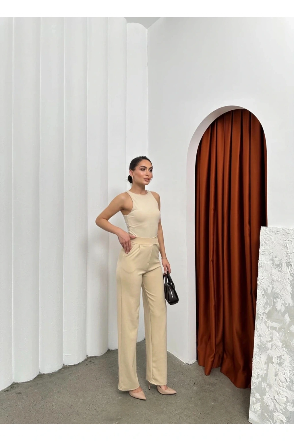 Şık ve rahat tasarımıyla dikkat çeken Krep Bej Cırtlı Pantolon, gardırobunuzun vazgeçilmez parçası olmaya aday!