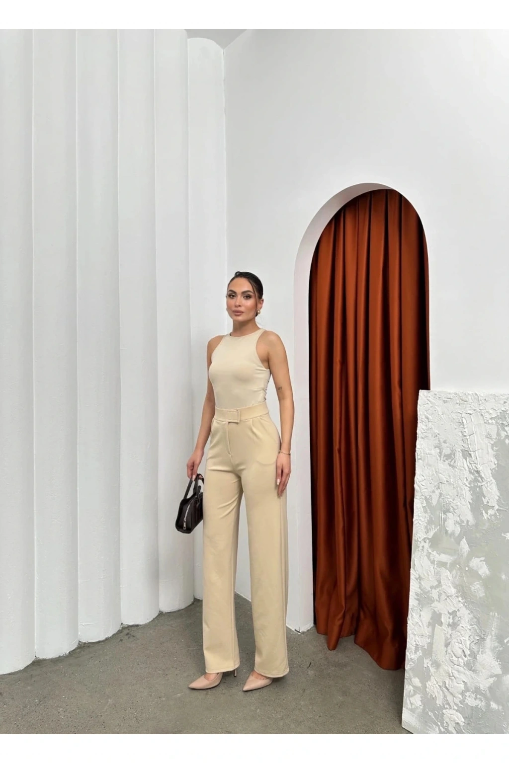 Şık ve rahat tasarımıyla dikkat çeken Krep Bej Cırtlı Pantolon, gardırobunuzun vazgeçilmez parçası olmaya aday!