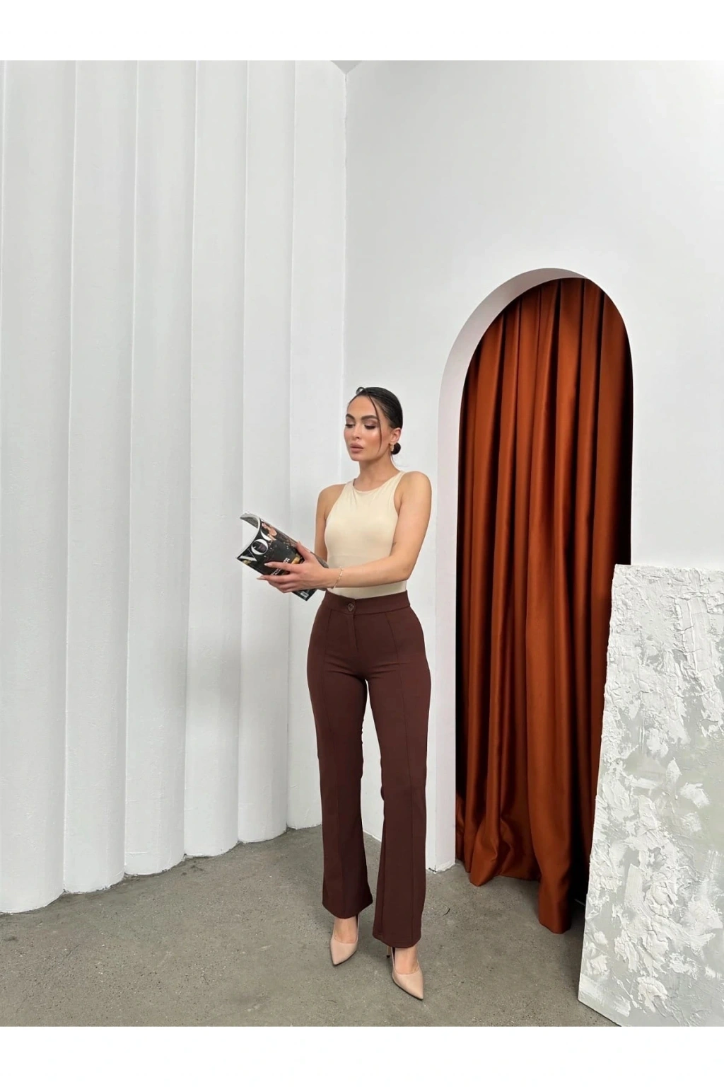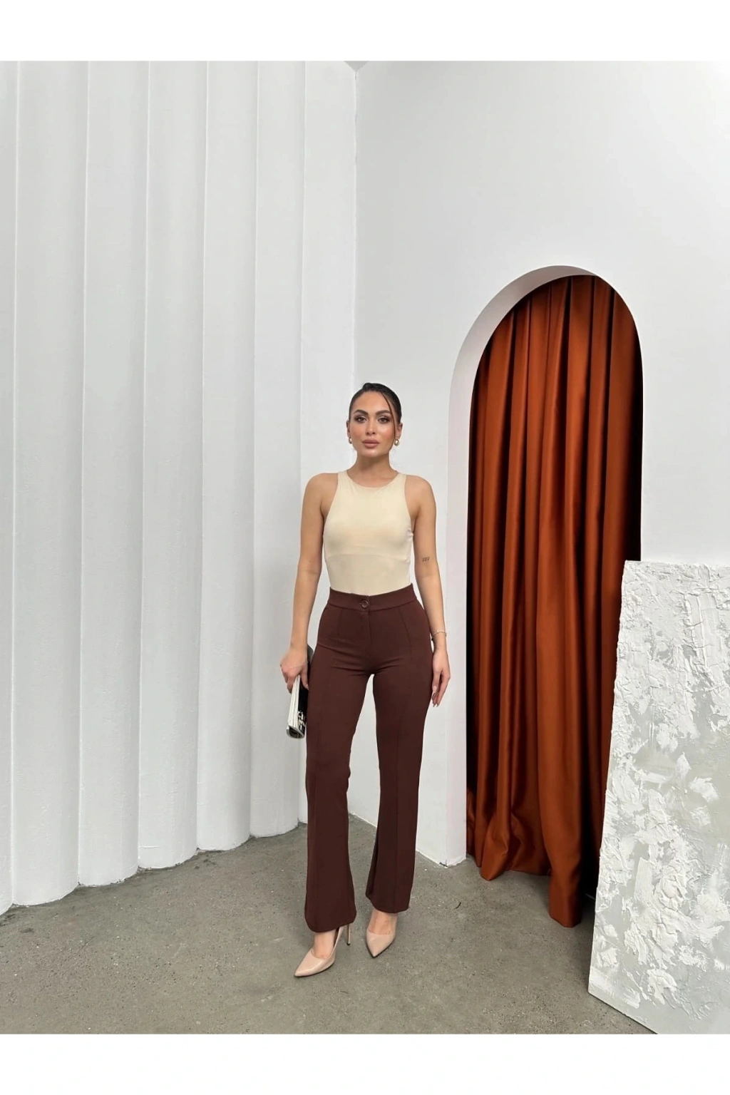 şık ve rahat tasarımıyla öne çıkan Düğmeli Palazzo pantolon kahve p170091, gardırobunuzun vazgeçilmezi olmaya aday!