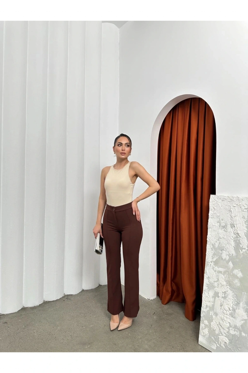 şık ve rahat tasarımıyla öne çıkan Düğmeli Palazzo pantolon kahve p170091, gardırobunuzun vazgeçilmezi olmaya aday!