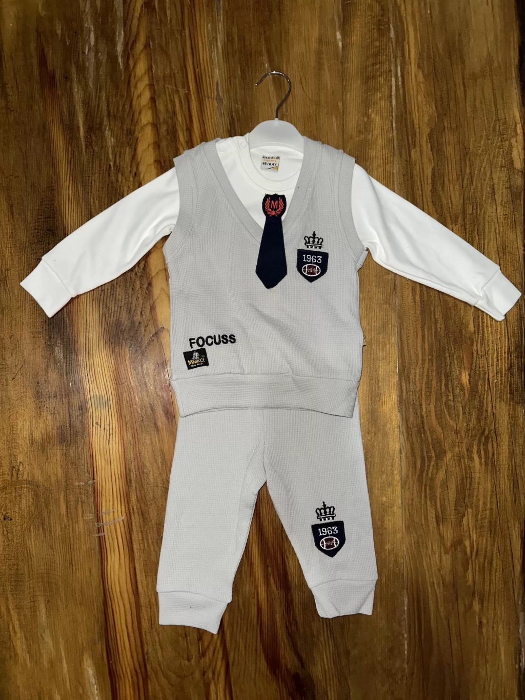 6-24 aylık kravatlı üçlü takım gri