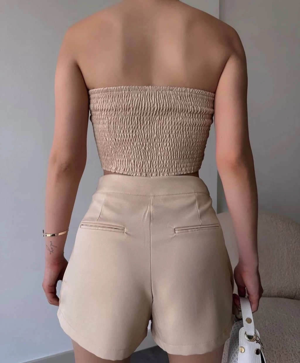 Arkadan büzgülü esnek büstiyer bej, kadın giyim kategorisindeki bluzlar arasında şıklık ve konforu bir araya getiriyor. Bu özel tasarım, hem günlük hayatta hem de özel davetlerde rahatlıkla tercih edebileceğiniz bir parça olacak.