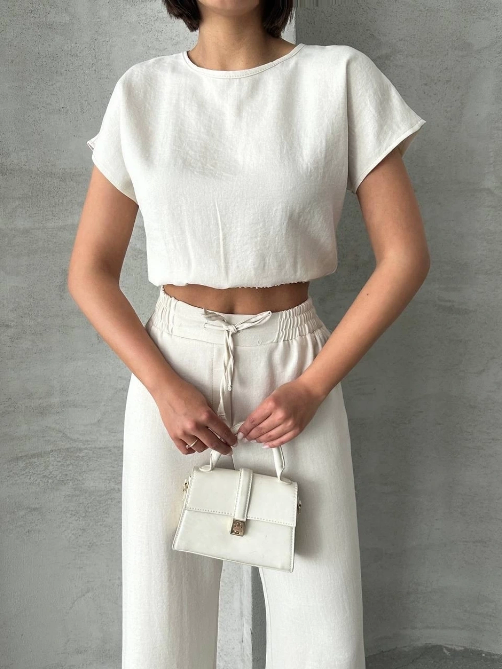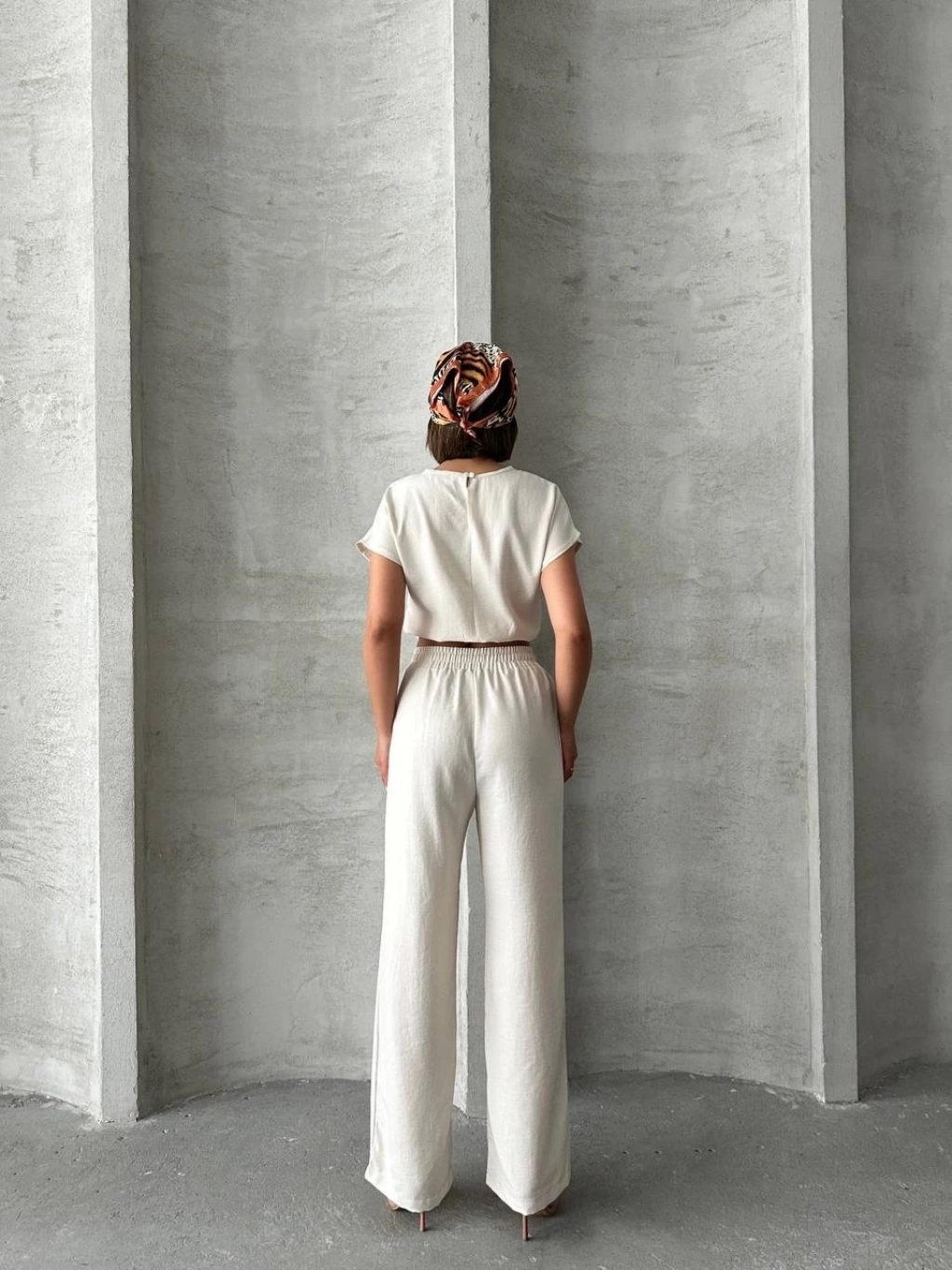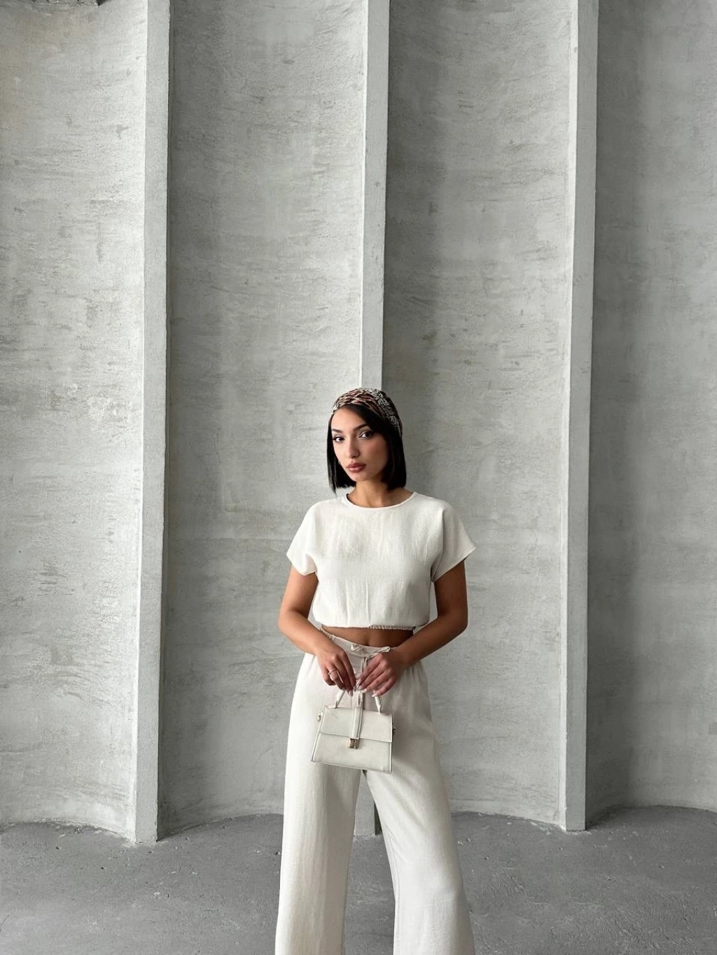 • Bluzunun düz kesimi ve pantolonunun yüksek bel tasarımı ile trend bir stil sunar.