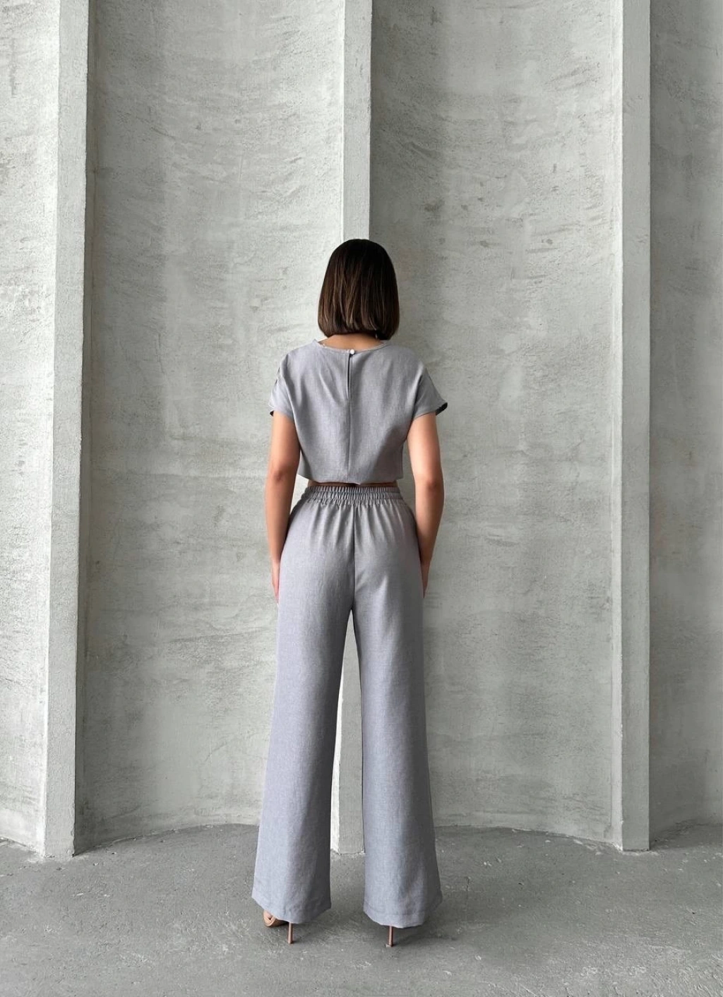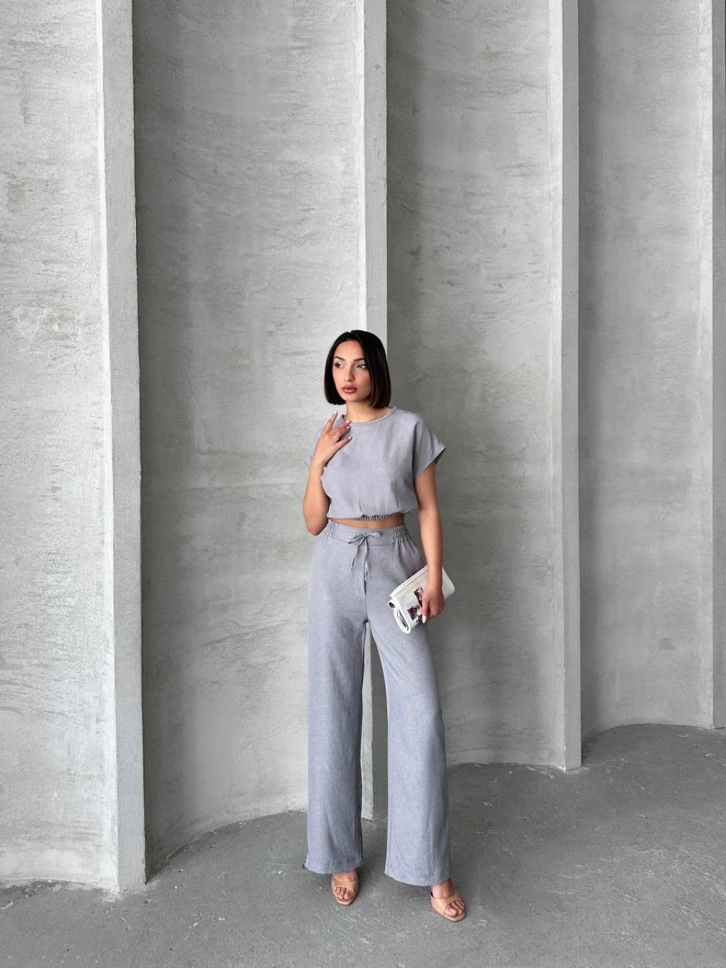 • Bluzunun düz kesimi ve pantolonunun yüksek bel tasarımı ile trend bir stil sunar.
