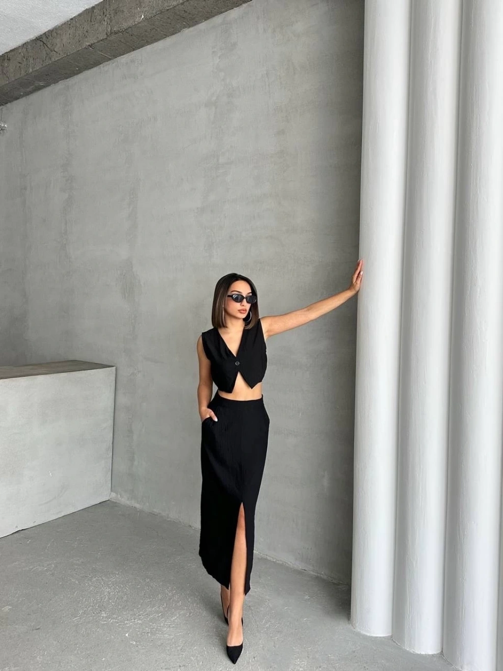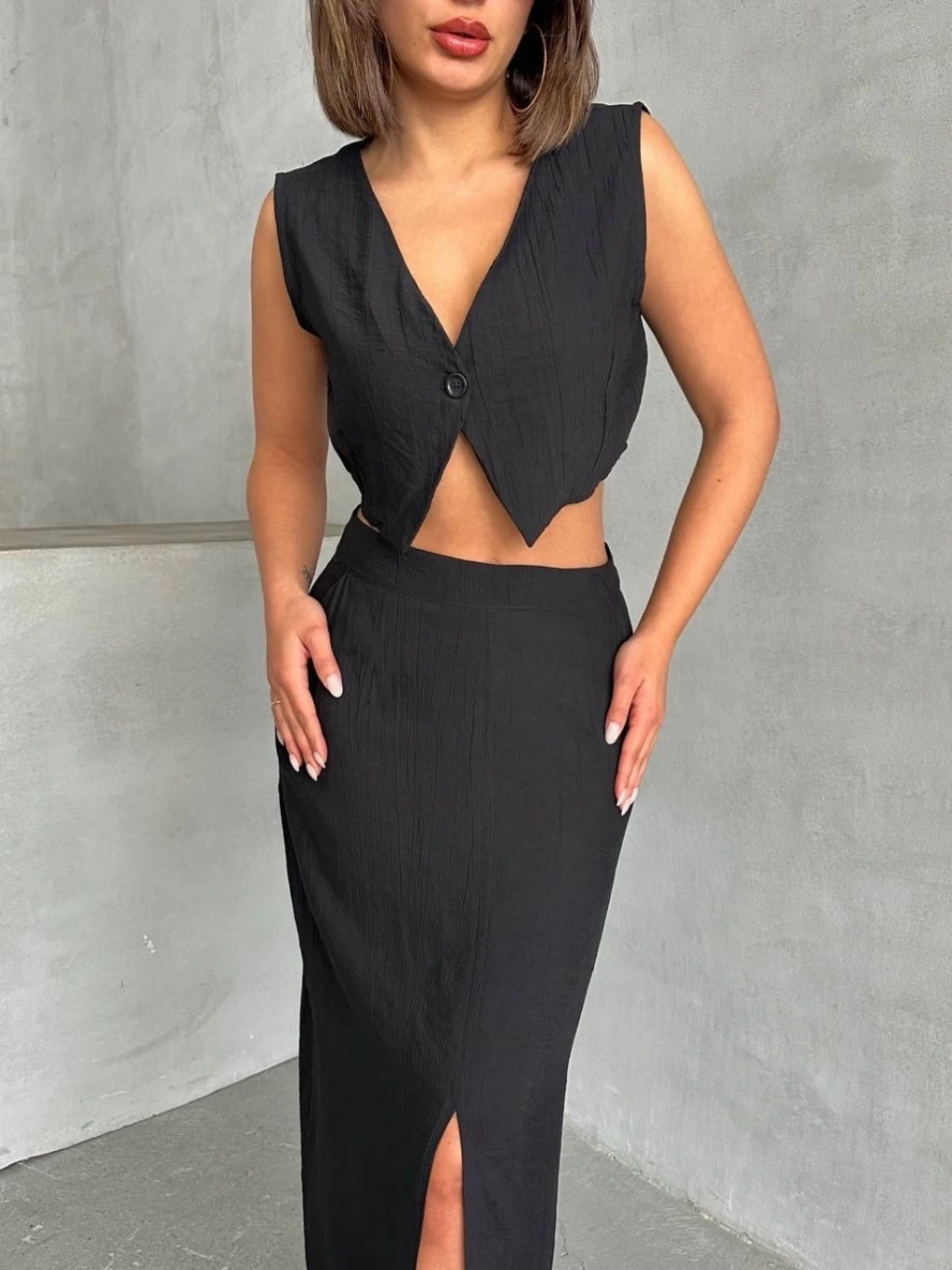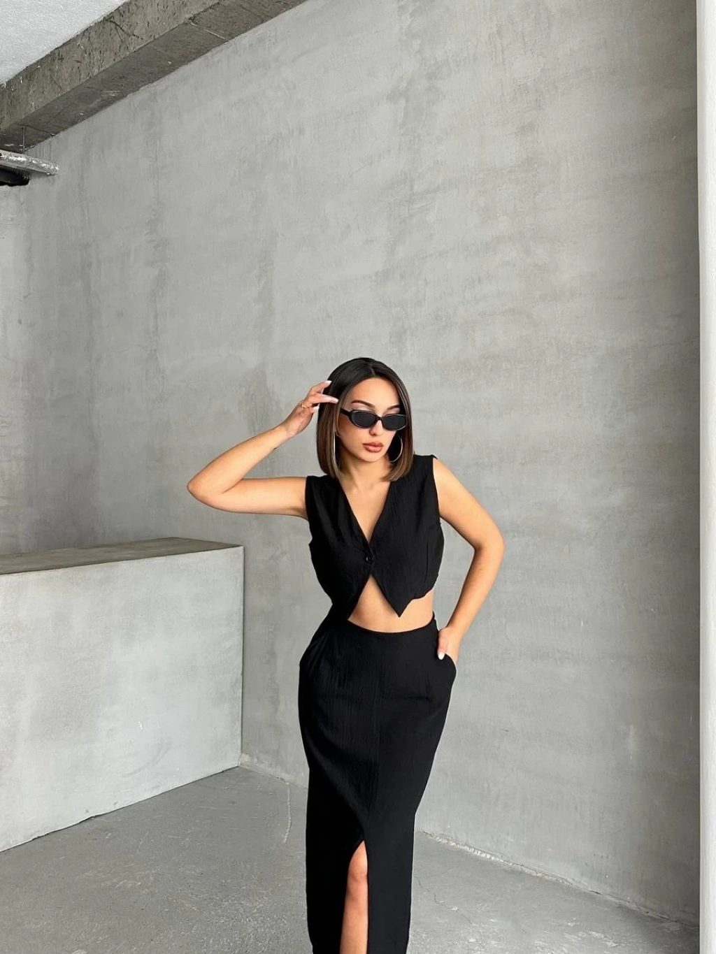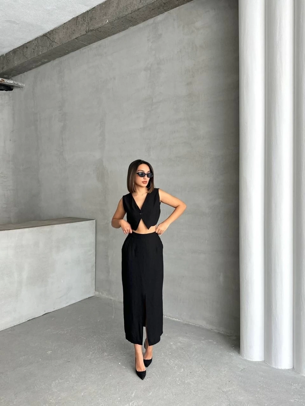 KAZAX markasının şık ve zarif tasarımıyla öne çıkan çilek takımı, etek ve yelek kombinasyonuyla dikkat çekiyor.