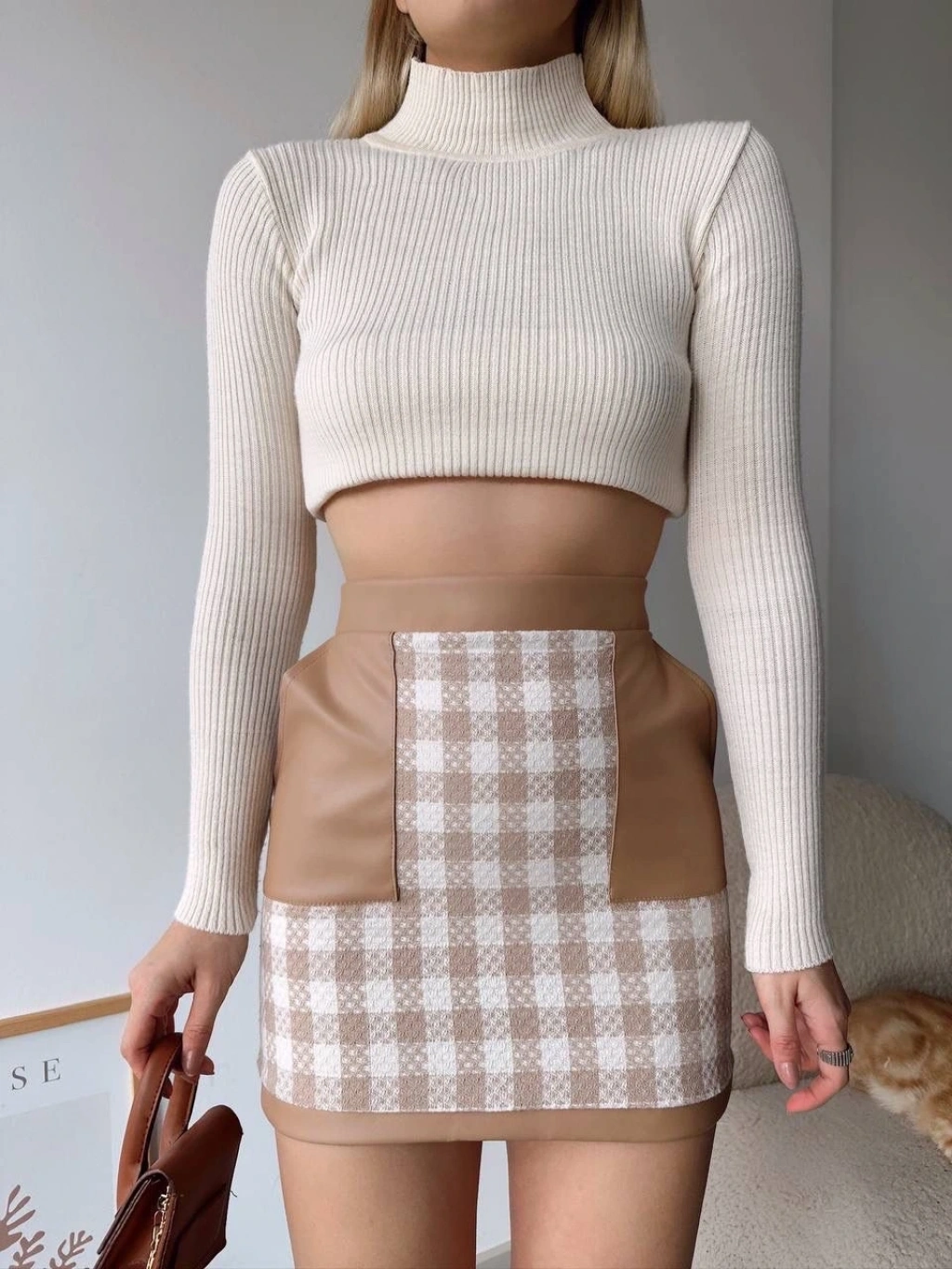 Deri cepleri eteğe modern bir hava katar.