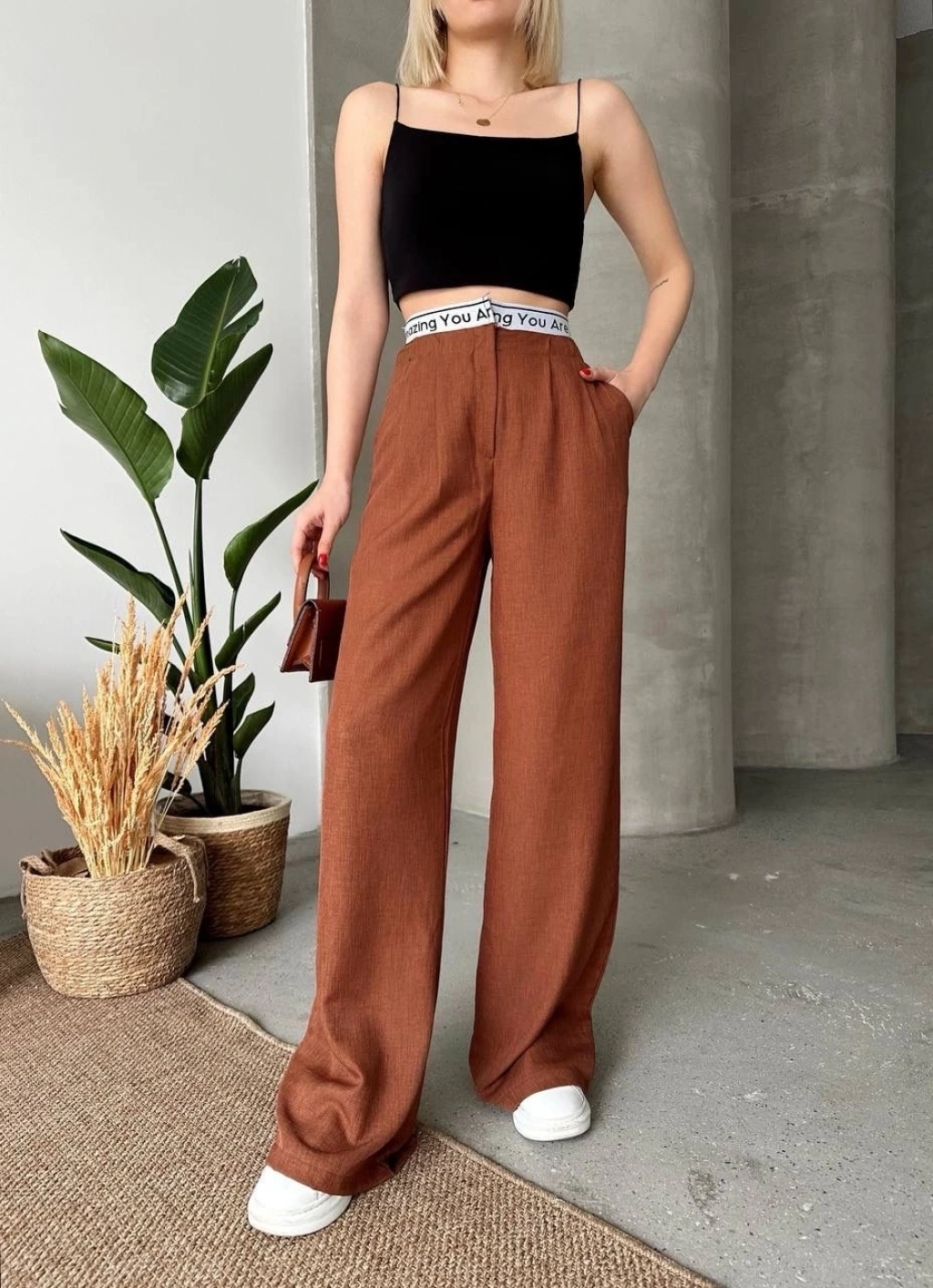 Flamlı kahve pantolon, şıklığı ve rahatlığı bir arada sunan bir seçenektir. Bu şık pantolon ile günlük hayatta veya özel davetlerde tarzınızı konuşturabilirsiniz.