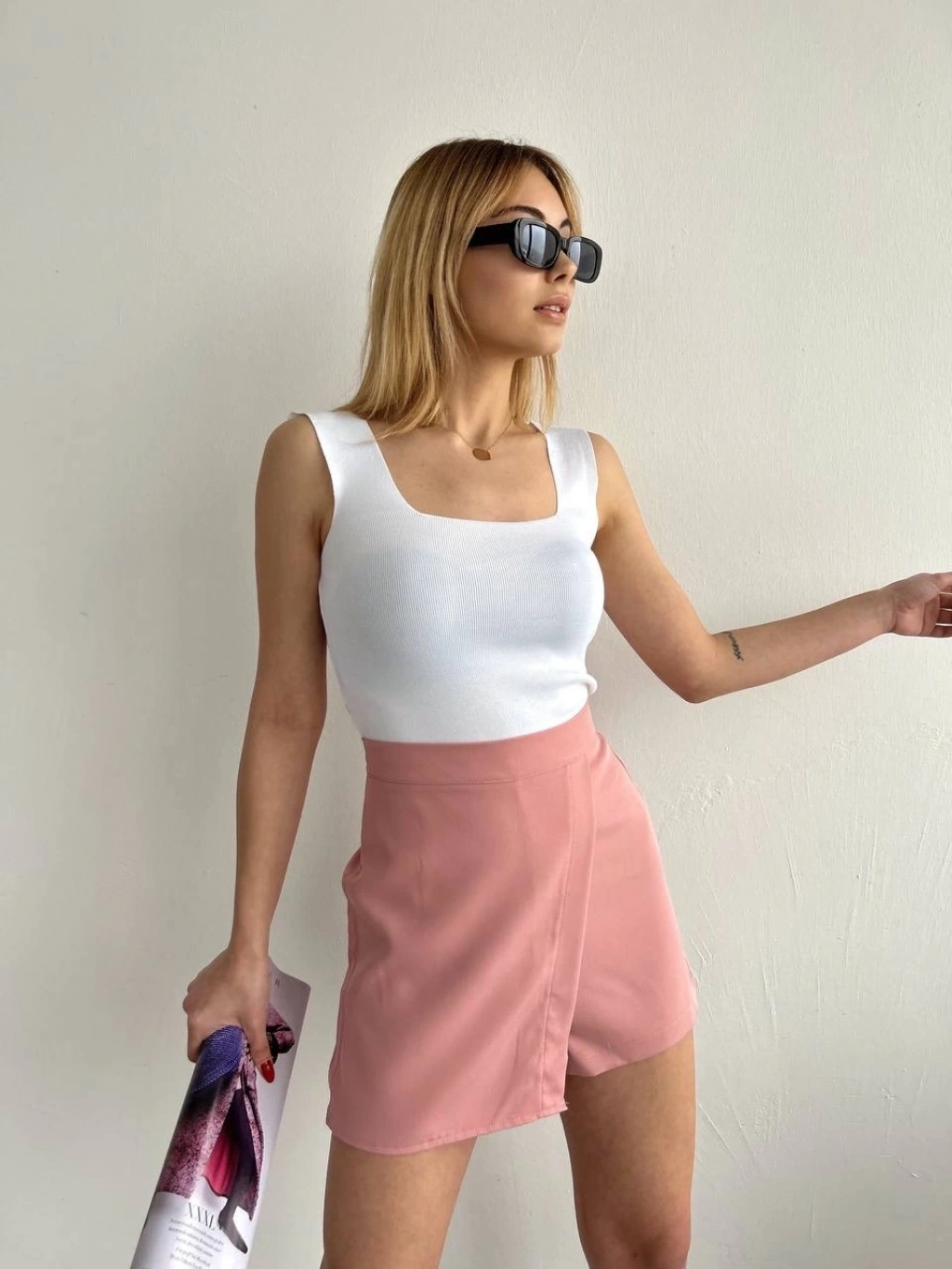 Bu harika pudra rengi şort eteği, günlük hayatta veya özel günlerde şıklıkla tercih edebilirsiniz.