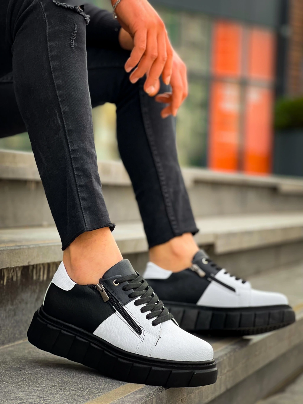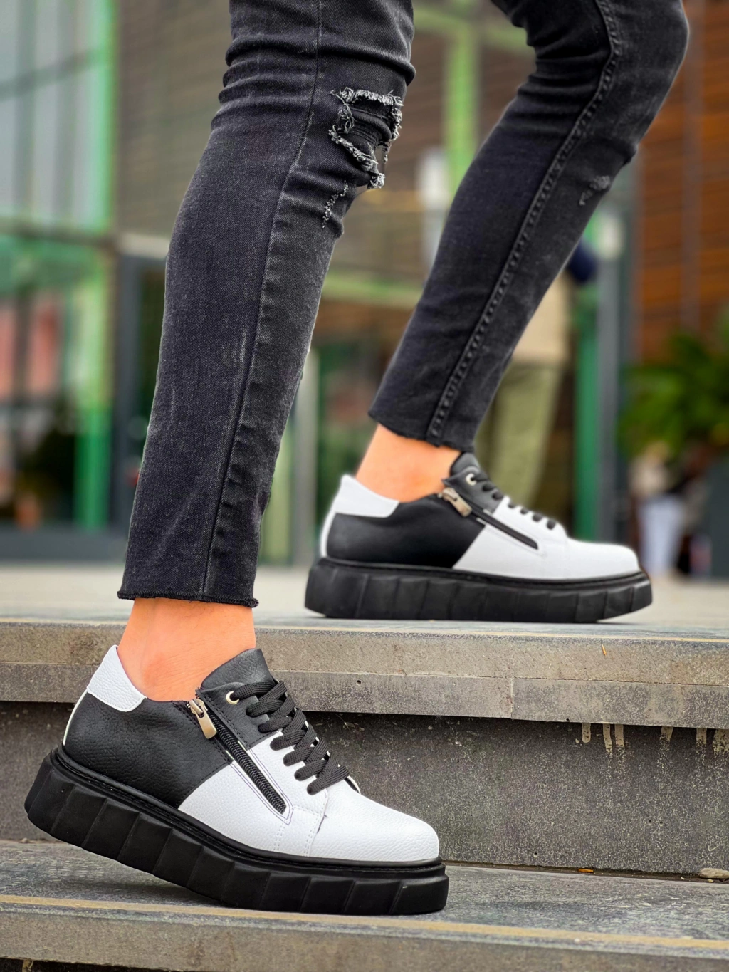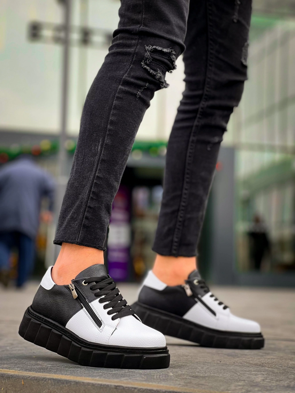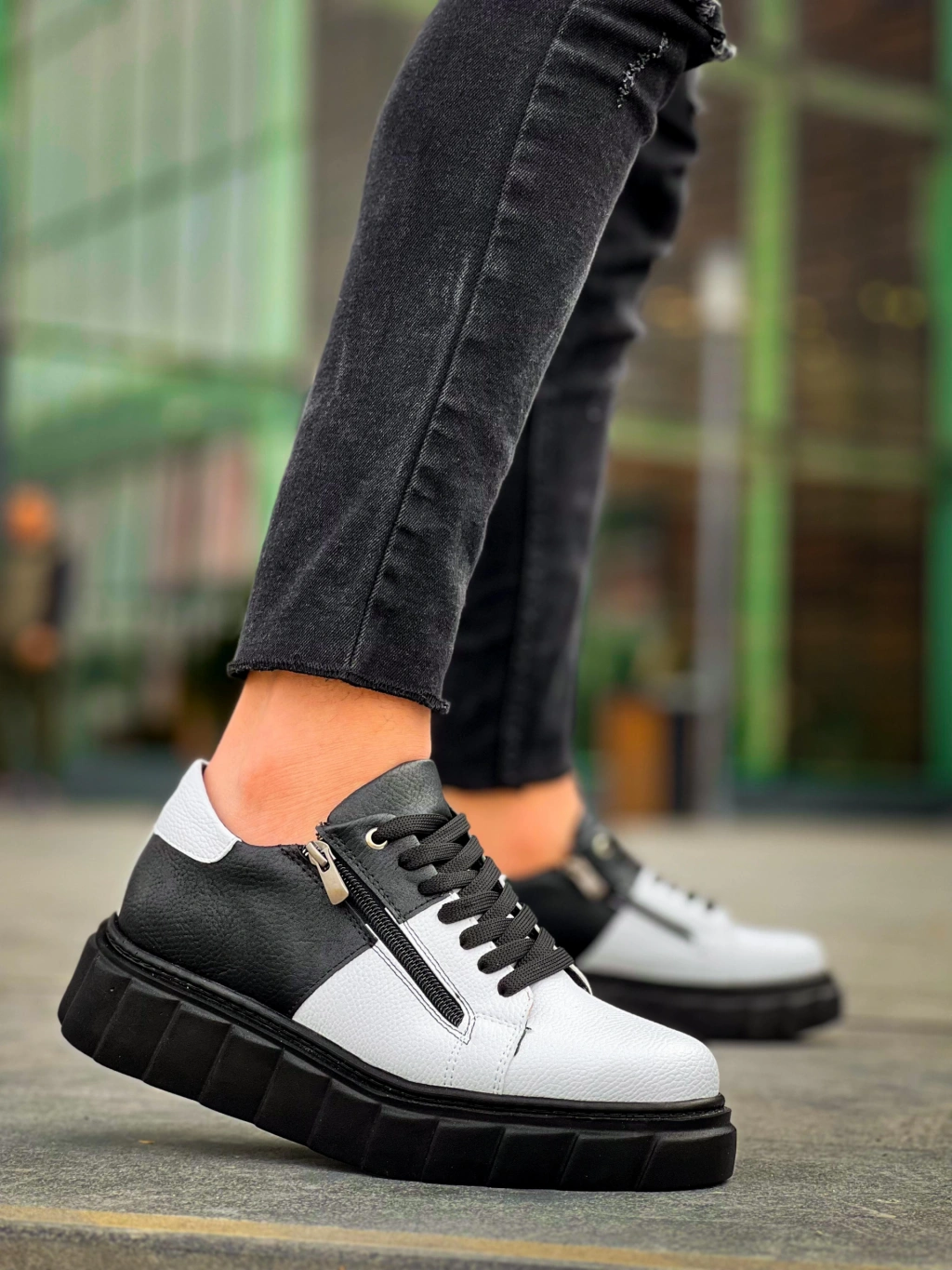 KB-X155 Kuback Beyaz Cilt Siyah Cilt Detaylı Siyah Yüksek Taban Günlük Spor Ayakkabı