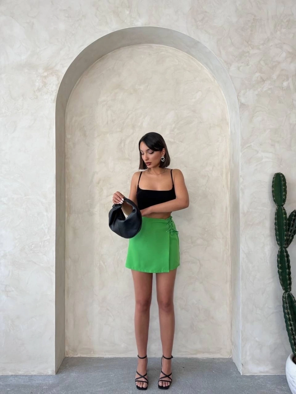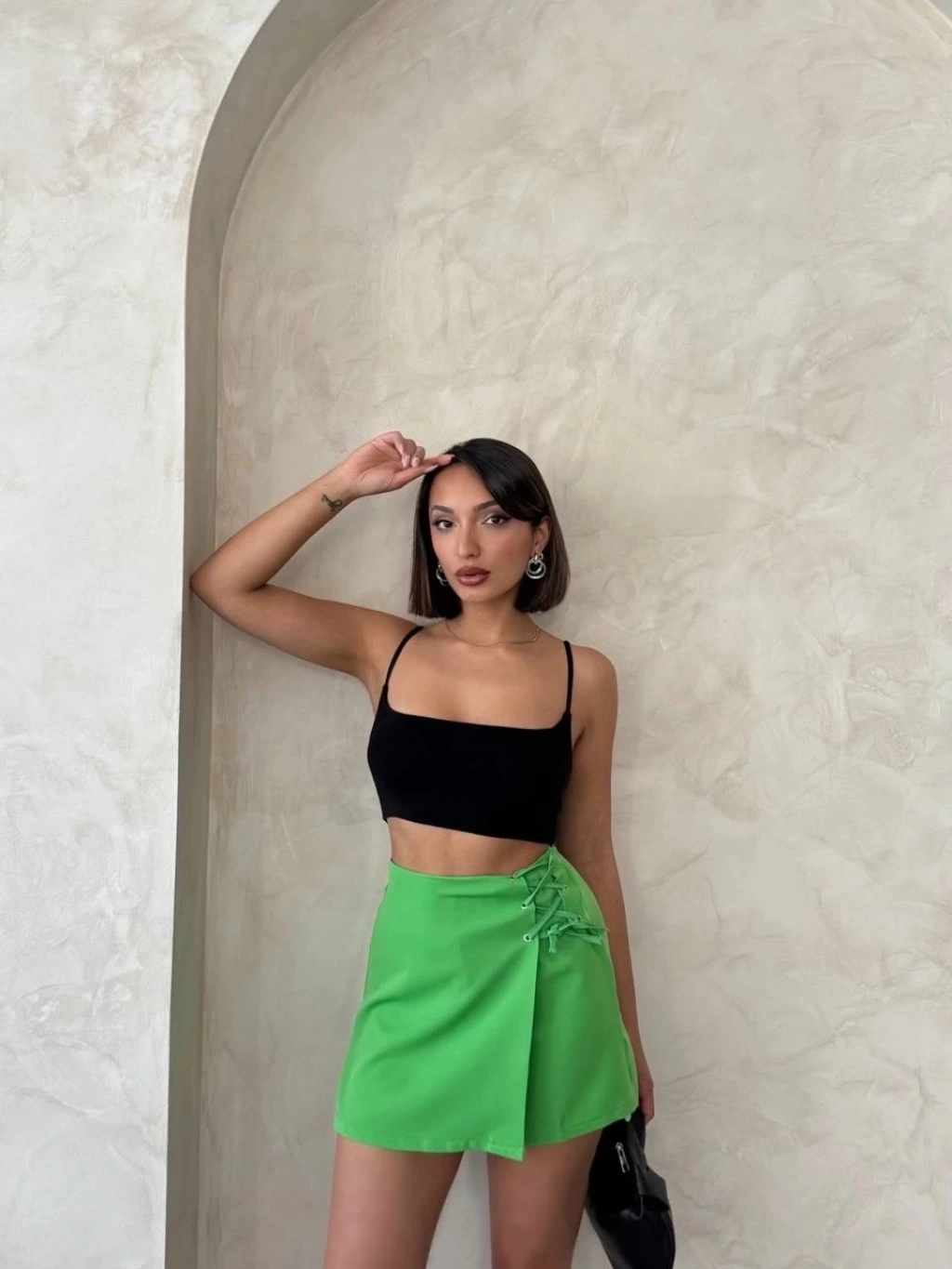 Şık yeşil rengi, yaz aylarında sizi ferah ve stil sahibi gösterecek. Yazın vazgeçilmezi olan şort etek, her kombinle rahatlıkla uyum sağlar.
