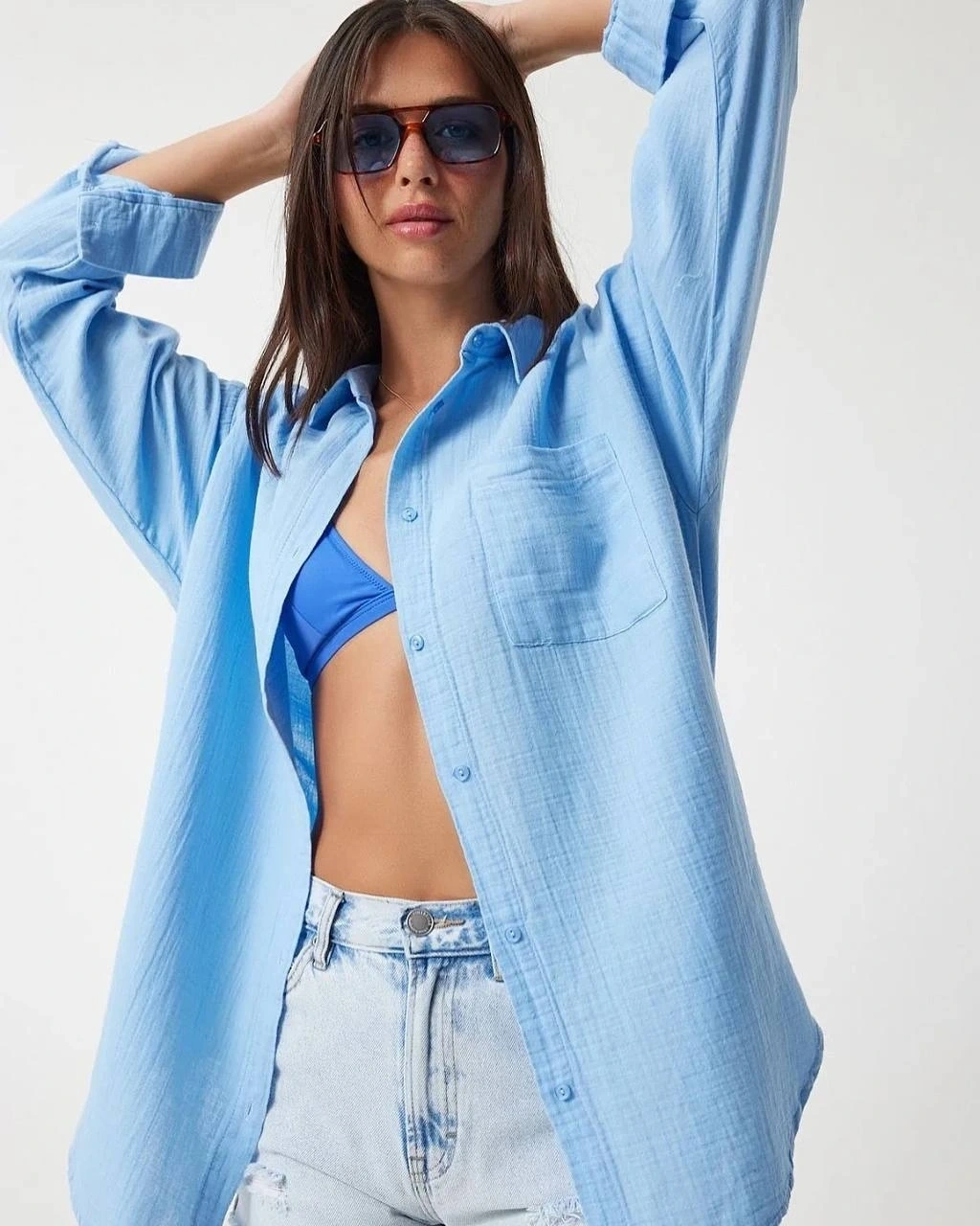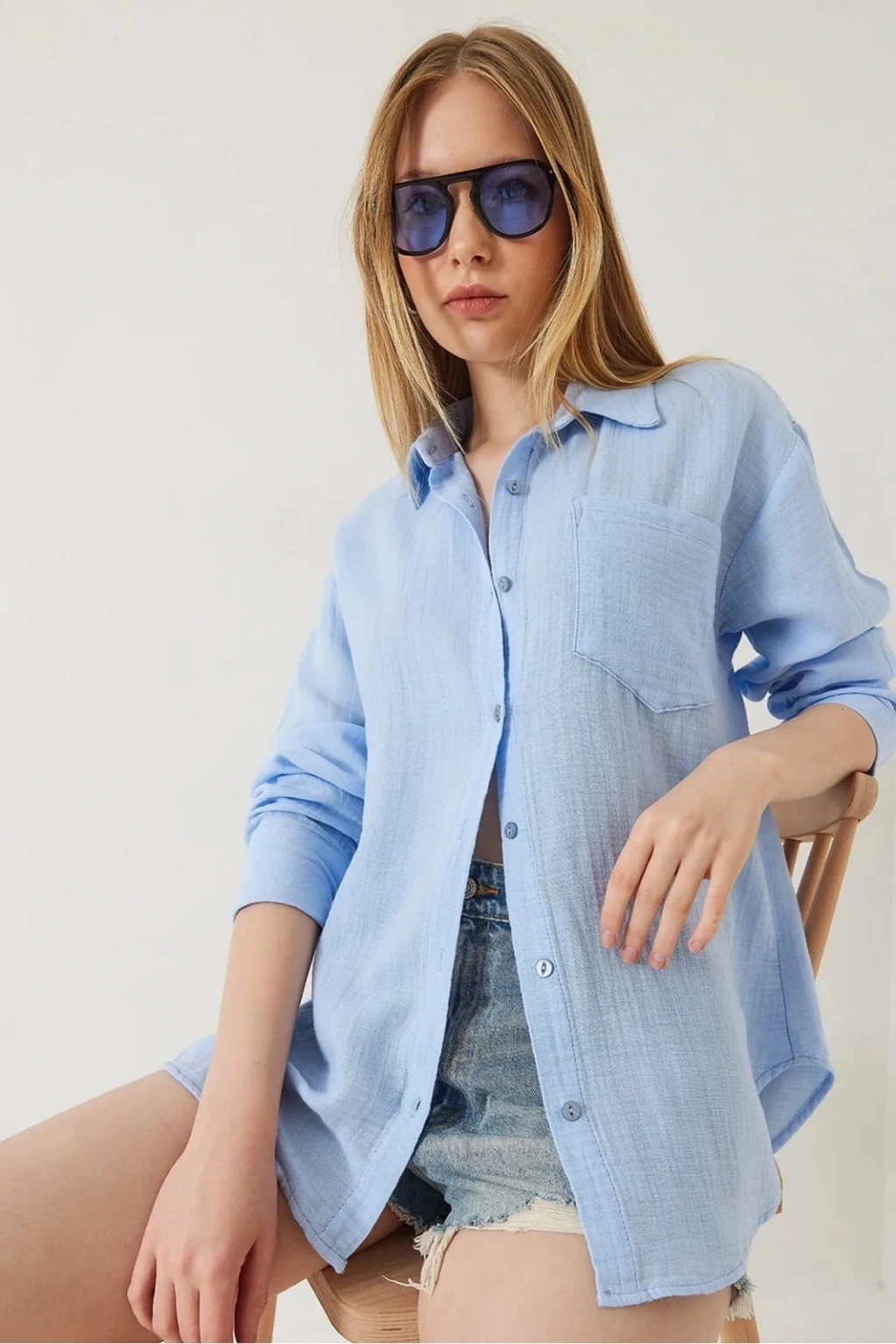 Bu mavi tek cepli müslin gömlek, gardırobunuzun vazgeçilmezi olmaya aday! Zarif tasarımı ve rahat kesimiyle şıklığı ve konforu bir arada sunar.