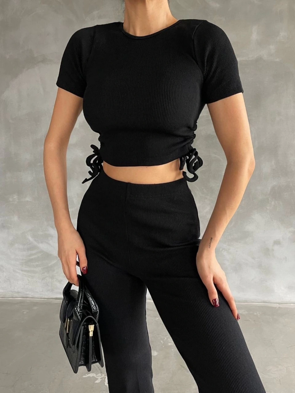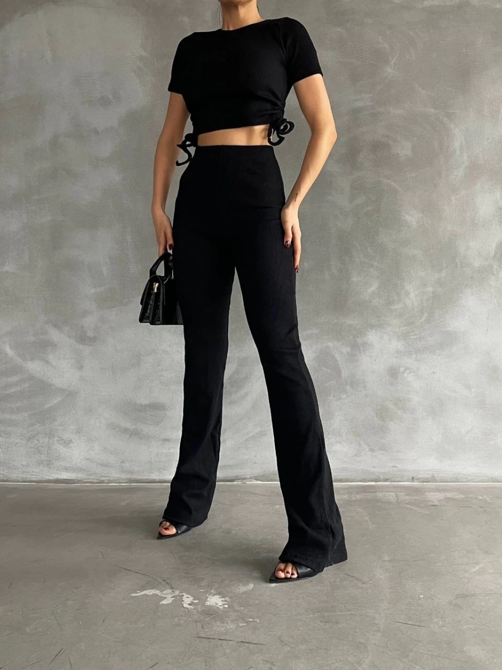 Yanları tünel detaylı pantolonu, uyumlu bluzu ile kombin tamamlar.