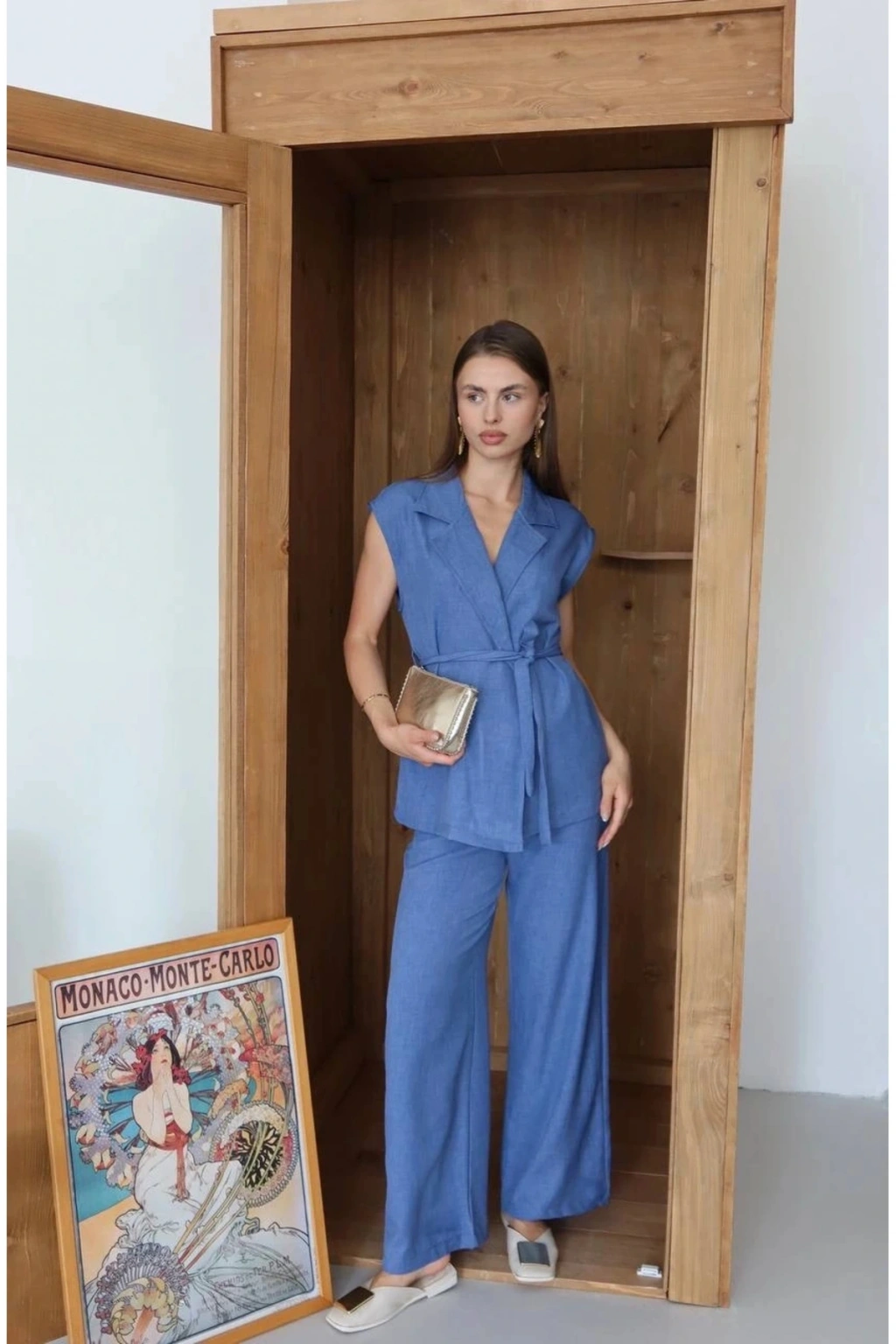 Keten yelek pantolon takım indigo pt