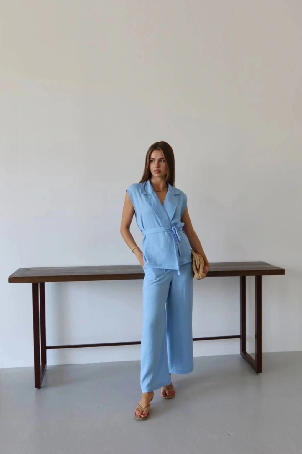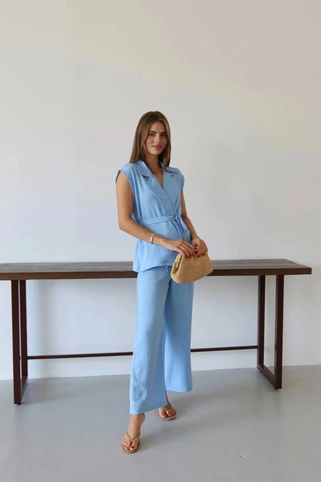 Şıklığı ve konforu bir arada arayan kadınların tercihi olan keten yelek pantolon takım mavi PT, gardırobunuzun vazgeçilmezi olmaya aday!